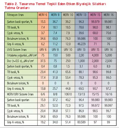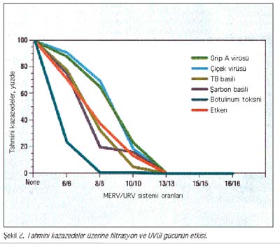 Tablo 2, aynı zamanda, UVGI oranları değerleriyle (URVs) karakterize edilen, UVGI etkilerinin değişik seviyelerinin tutma veya yok etme oranlarını özetlemektedir. Doz, birçok UVGI sistemini temsil eden, 0.5 saniye etki süresiyle çarpılan ortalama yoğunluktur. URV, ortalama UVGI yoğunluk derecesi 20 olan sistemin tavsiye edilen oranıdır. MERV oranlarına paralel URV oranları, aerobiyolojik uygulamalar için, filtrelerin ve UVGI sistemlerinin seçiminde uygun bir yol sağlamaktadır. Benzer MERV ve URV oranlarına sahip hava temizleme cihazlarının kullanımı, mümkün olan tüm etken biyolojik silahlar karşısında dengeli bir tutma oranı sağlar (etki süresi yaklaşık 0.5 saniye).