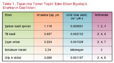 Analiz için seçilen, tasarım için temel teşkil eden beş aracı biyolojik silahın özellikleri Tablo 1’de gösterilmektedir. Logaritmik ortalama çaplar, harhangi bir model filtre için filtrasyon oranını belirler. UVGI oran sabitleri, laboratuvar çalışmalarını referans alarak hesaplanmıştır. Çiçeğin, UVGI oran sabiti, çok benzer özellikler gösteren Vaccinia (aşı) virüsüyle aynı varsayılmıştır.