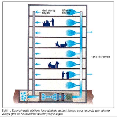 Şekil 1, dış hava girişinde biyolojik silahların serbest bırakılması senaryosunu örneklemektedir. Genellikle, dış hava girişindeki serbest bırakmalar bina sakinlerine diğer serbest bırakmalardan daha büyük tehditler yaratacaktır çünkü, etkenlerden çoğu (eğer hepsi olmazsa) havalandırma sistemine girecek ve sistemin hizmet verdiği tüm bölgelere yayılacaktır.