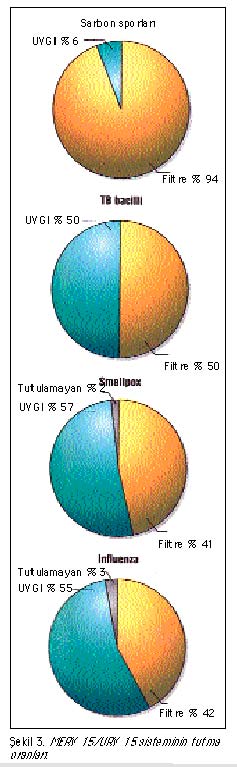 Farklı farklı gerçek binaları (hava kaçakları, baca ve filtre baypas etkilerini içeren binalar) incelemek için daha fazla araştırma gerekmesine rağmen, nispeten gösterişsiz hava temizleme sistemleriyle uygun korunmanın elde edilebileceği görünmektedir. Tablo 2’deki herbir cihazla elde edilen tutma oranlarını ve %15 dış havanın sulandırılmasının etkisini düşündüğümüzde bunun hiçte şaşırtıcı olmadığını görmekteyiz. MERV/URV sisteminde, hava temizlemenin ne kadarının filtre, ne kadarının UVGI tarafından yapıldığını bilmek yararlı olur. Şekil 3, MERV 15/URV 15 sisteminin tutma oranlarını göstermektedir. Dikkat edilmelidir ki; filtre şarbon için, UVGI çiçek için, işin büyük bir kısmını yapmaktadır.