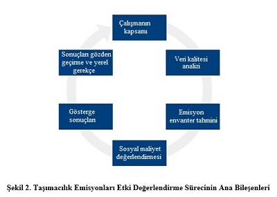 Aşağıdaki bölümlerde ayrıntılara girmeden önce, ulaşım emisyonları etki değerlendirme sürecinde yer alan altı ana bileşene hızlı bir tur sağlayan Şekil 2 incelenirse: