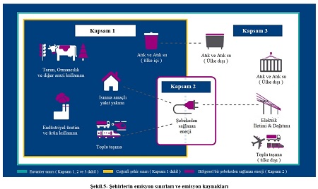 • Kapsam 3: Şehir sınırları içinde gerçekleşen faaliyetler sonucunda şehir sınırları dışında meydana gelen diğer tüm sera gazı emisyonlarını içerir [1].