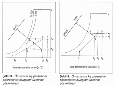 Kış prosesinde ön ısıtıcı konulması gerekiyor ise proses çizimi 6 noktalıdır. Bu noktalar; I. Nokta Dış hava, 2. Nokta iç hava, 3. Nokta Karışım havası, 4. Nokta Ön ısıtıcıdan çıkış, 5. Nokta Nemlendiriciden çıkış ısıtıcıya giriş, 6. Nokta Isıtıcıdan çıkan ve ortama üflenen havadır. Karışım havası 1 noktasına yani dış hava şartlarına yakın ise ön ısıtıcı konulur.