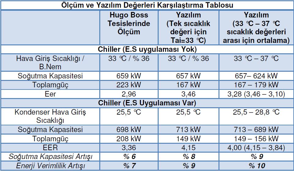 • Çalışmada chiller enerji verimlilik oranı EER’nin 2.96 dan 3.36’ya yükseldiği; soğutma kapasitesinin % 6 arttığı bulunmuştur.