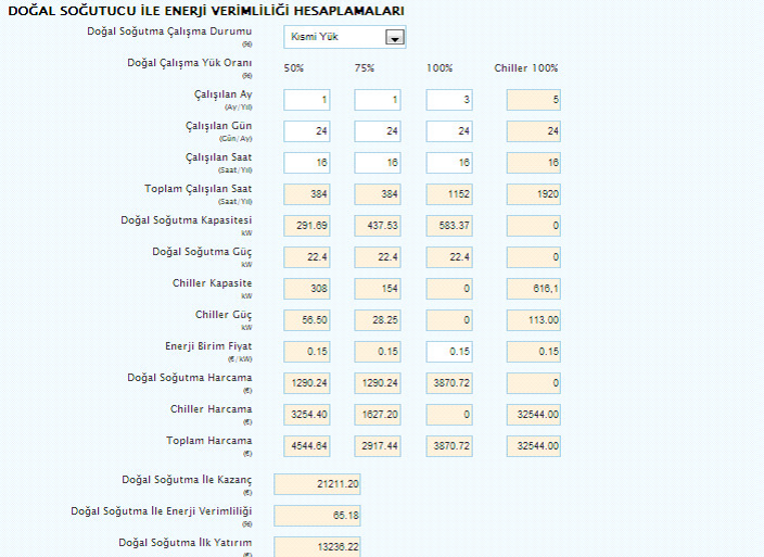 • Yazılımda benzer kapasite ve şartlarda seçilen bir chiller ile kısmi soğutma için yapılan hesaplama karşılaştırmasında verimlilik artışı % 65 değerlerinde hesaplanmıştır. Bu hesaplamalarda uyumluluk olduğu görülmüş ve doğal soğutma hesapları doğrulanmıştır.
