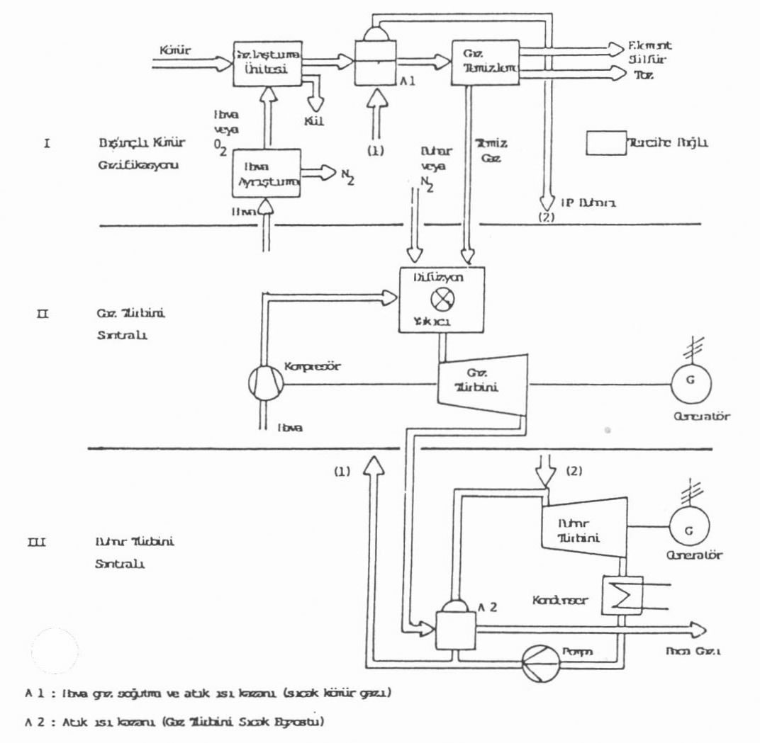 Buhar türbini ünitesinden gelen besi suyu gazlaştırma sırasında meydana gelen atık ısı ve gene gazifikasyon sonrası kömür-gazın soğutulması sırasında kazanılan ısı ile buharlaştırılarak buhar türbinine (2) verilmektedir. Atık ısı kazanında soğutulan kömür gazın içindeki çevre ve gaz türbini için zararlı H2S, COS, alkali, halojen, vanadyum, tuz gibi maddeler gaz temizleme.ve yıkama ünitesinde önce kimyasal yolla kükürt bileşiği gazlar temizlenerek elementer sülfür elde edilmekte diğer zararlı gazlar ve maddeler ise kimyasal ve yıkama yolu ile temizlenmektedir. Yıkama suyu, öğütülmüş kömür ile karıştırılarak kömür taşıma ve gazlaştırma gayesi ile kullanılmakta veya atık su temizleme sistemine verilmektedir. Temizlenmiş gaz yukarıda da açıklanığı gibi N2 ile karıştırılarak seyreltildikten sonra difüzyon yakıcıda gaz türbini kompresöründen gelen hava ile karıştırılarak yakılmakta ve yanma sonucu oluşan yüksek sıcaklıktaki (1200°C) gaz, gaz türbini kanatlarından geçerek genleşmekte ve gaz türbinini döndürmektedir. Gaz türbini şaftına bağlı generatörde üretilen elektrik enerjisi sisteme verilmektedir. Gaztürbini egzost gazı ise (500-600°C) buhar türbini üni-tesinedeki atık ısı kazanından geçirilerek buhar elde edilmektedir. Gazlaştırma ünitesinde ve Buhar türbini ünitesinde elde edilen yüksek basınç ve alçak basınç buharları ile aynı şafta bağlı alçak ve yüksek basınç türbinlerinden geçirilerek türbinler döndürülmekte ve aynı şafta bağlı buhar türbini generatörü vasıtası ile elektrik üretilmektedir. Gaz türbini buhar türbini ve generatör aynı şafta bağlı düzenlemelerde bulunmaktadır.
