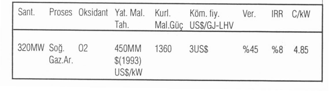 Bu çalışmaya göre Kömür Gaz Kombine Çevrim Santrallarının yatırım maliyetlerindeki %20 bir artış elektrik üretim maliyetlerini 0.5-0.7 cent daha artırmaktadır. İngiliz Enerji Bakanlığı ve John Brown tarafından (Kömür Santralı için) yapılan ve aynı baza getirilen çalışmalar yüksek verimleri nedeniyle Kömür Gaz Santralları üretim maliyetlerinin çok kısa bir sürede konvansiyonel kömür santrallarının altında kalacağı 1990 yıllarının sonunda teknolojik olgunluğa erişecek olan sıcak gaz arıtma sistemli Kömür Gaz Santrallarının yüksek verimi, düşük yatırım maliyetleri nedeniyle Konvansiyonel Kömür Santrallarının kesin alternatifi olacağı görülmektedir. Hiçbir ilave yakıt gerektirmeden gaz türbini çıkış gücünü %20 artıran, konvansiyonel Santrallara göre %25 daha az yakıt yakan, katı, gaz ve sıvı atıklar açısından konvansiyonel santralların yaklaşık yarısına eşdeğer atık bırakan bu santrallar teknolojik evrim sürecinde bazı teknolojik sorunları bulunsa da 2000'li yıllara doğru doğal gaz fiyatlarında beklenen artışlarla santral teknolojisinin olgunlaşması çakışacağından 1990'lı yılların sonunda Kömür Santralı yatırımlarında önemli bir paya sahip olacakları görülmektedir.